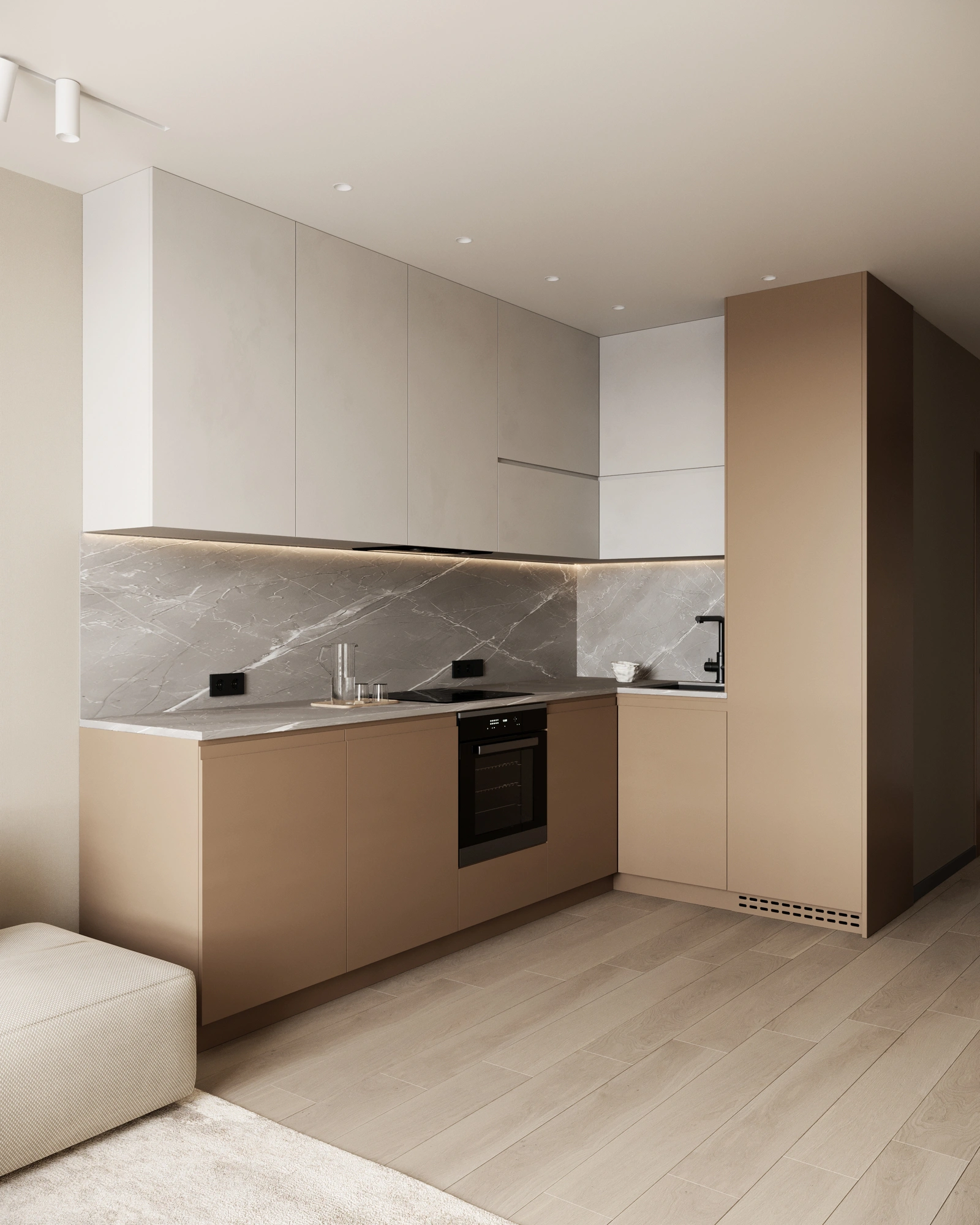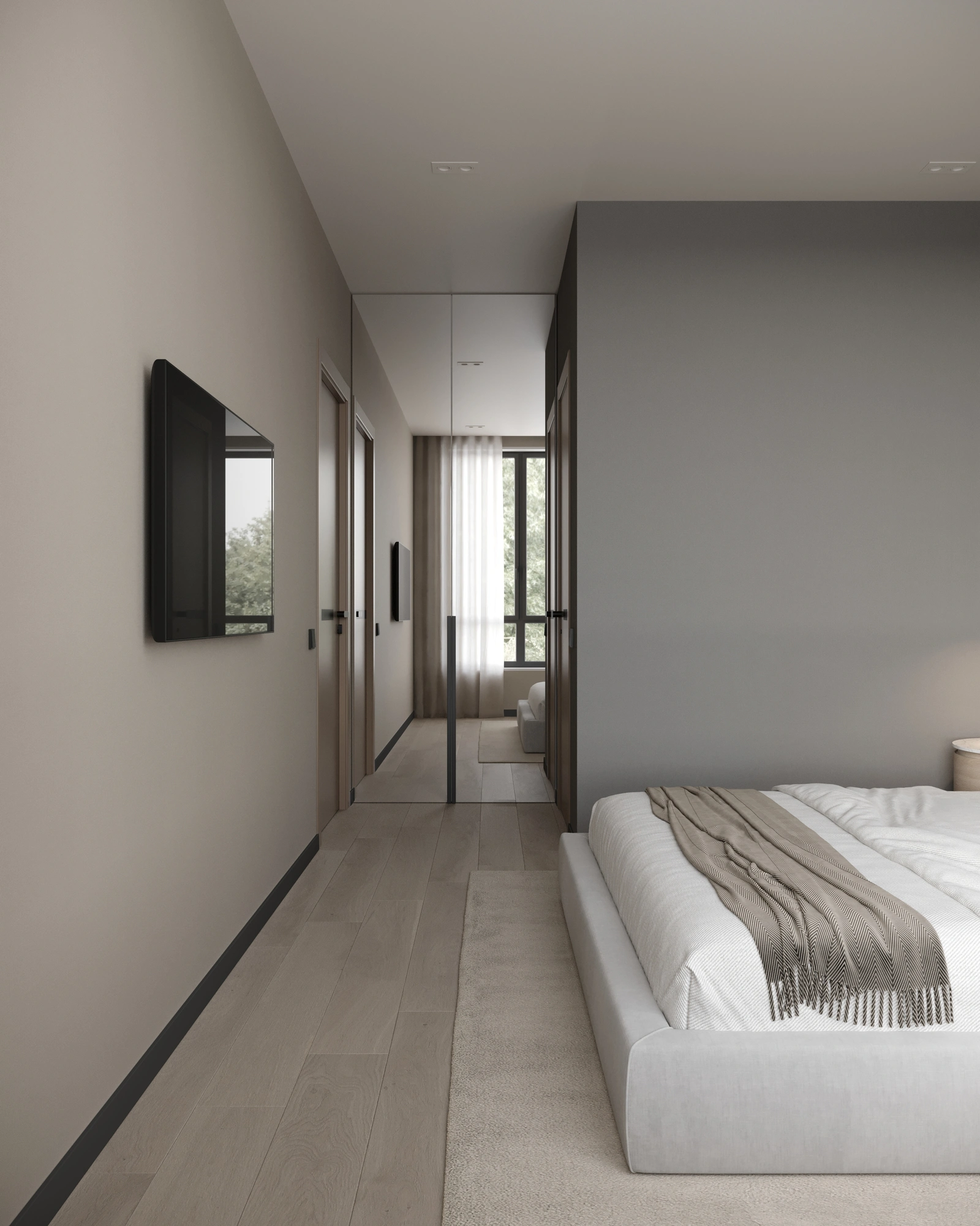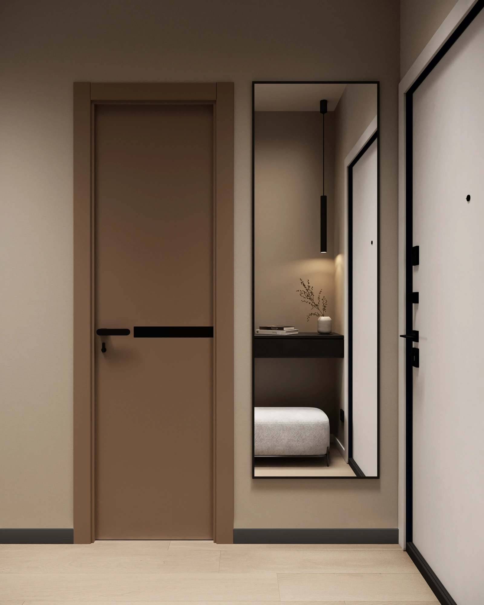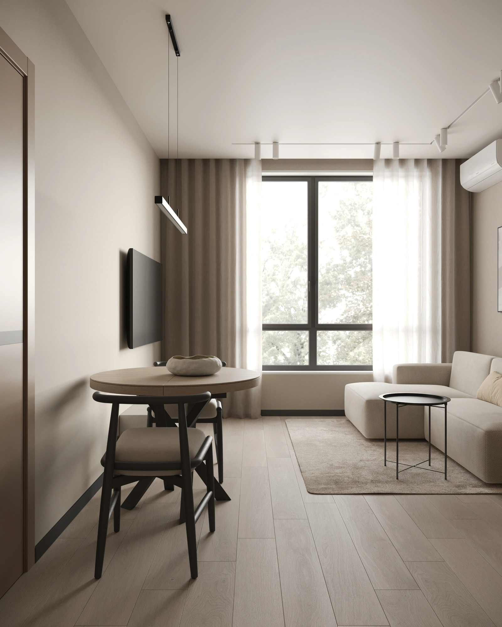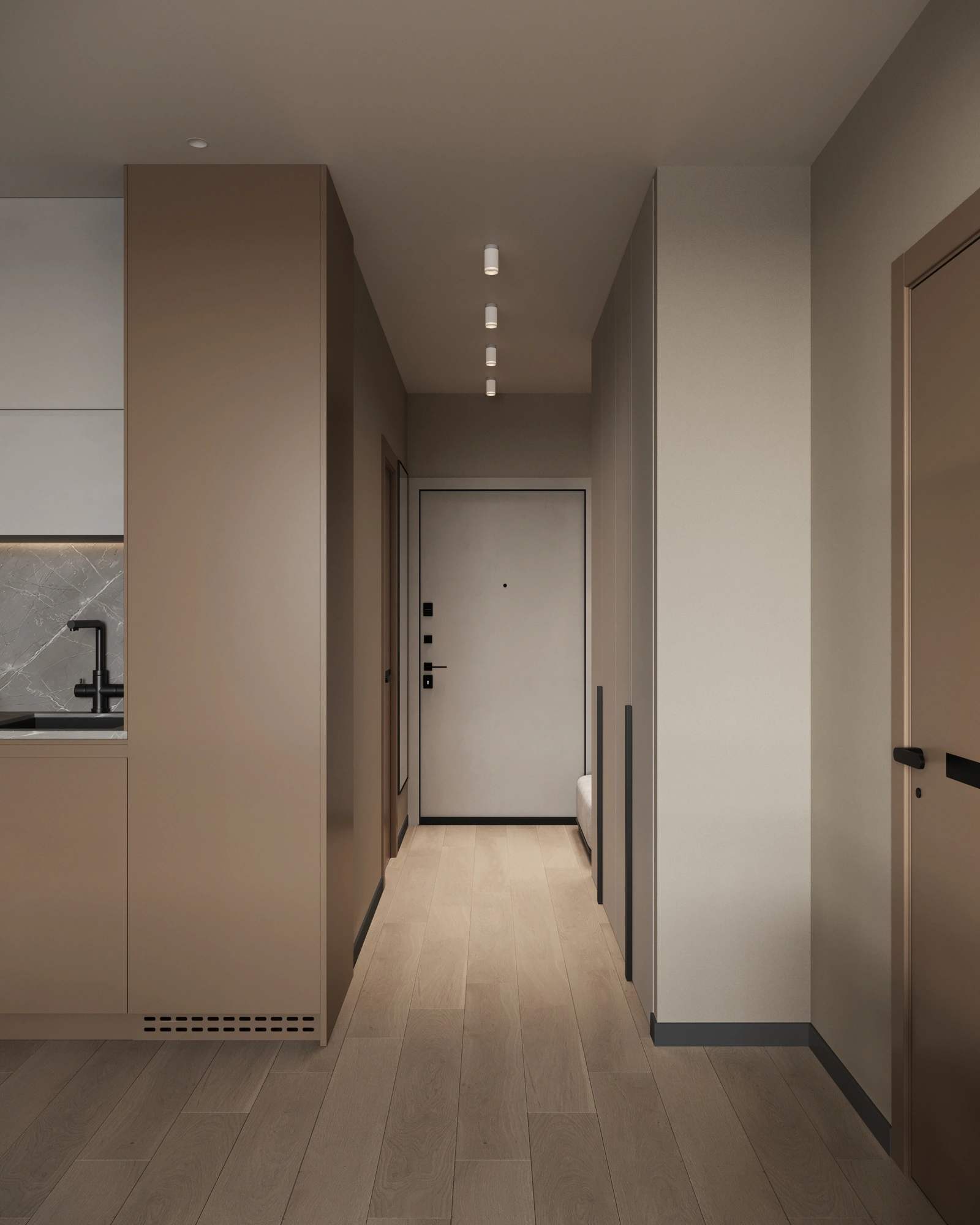 Отделка спальни, кухни-гостинной и прихожей: плитка ПВХ на полу, флизелиновые обои светлых тонов, встроенные точечные светильники, подвесы, натяжной потолок, двери Holz
