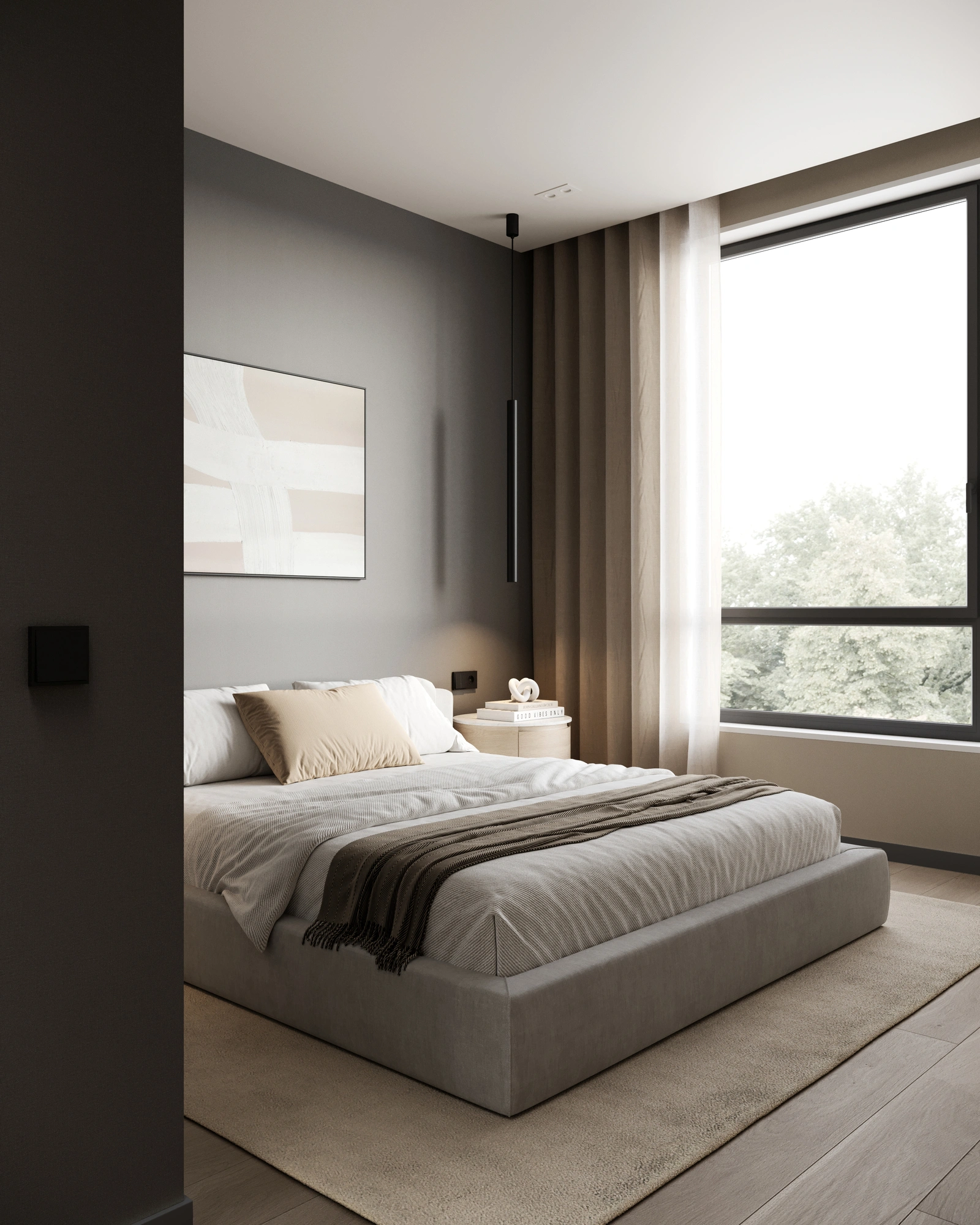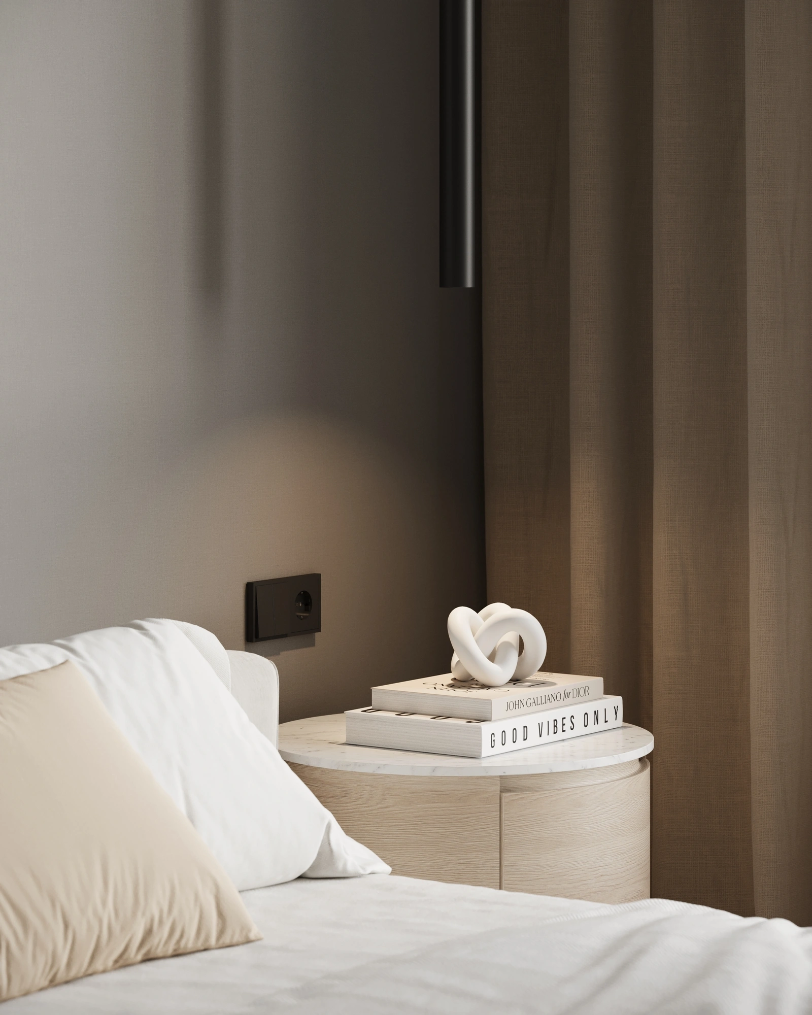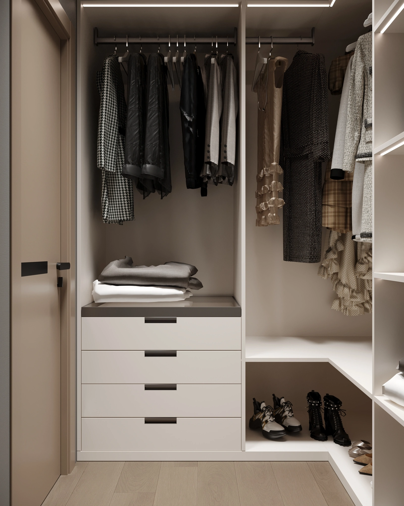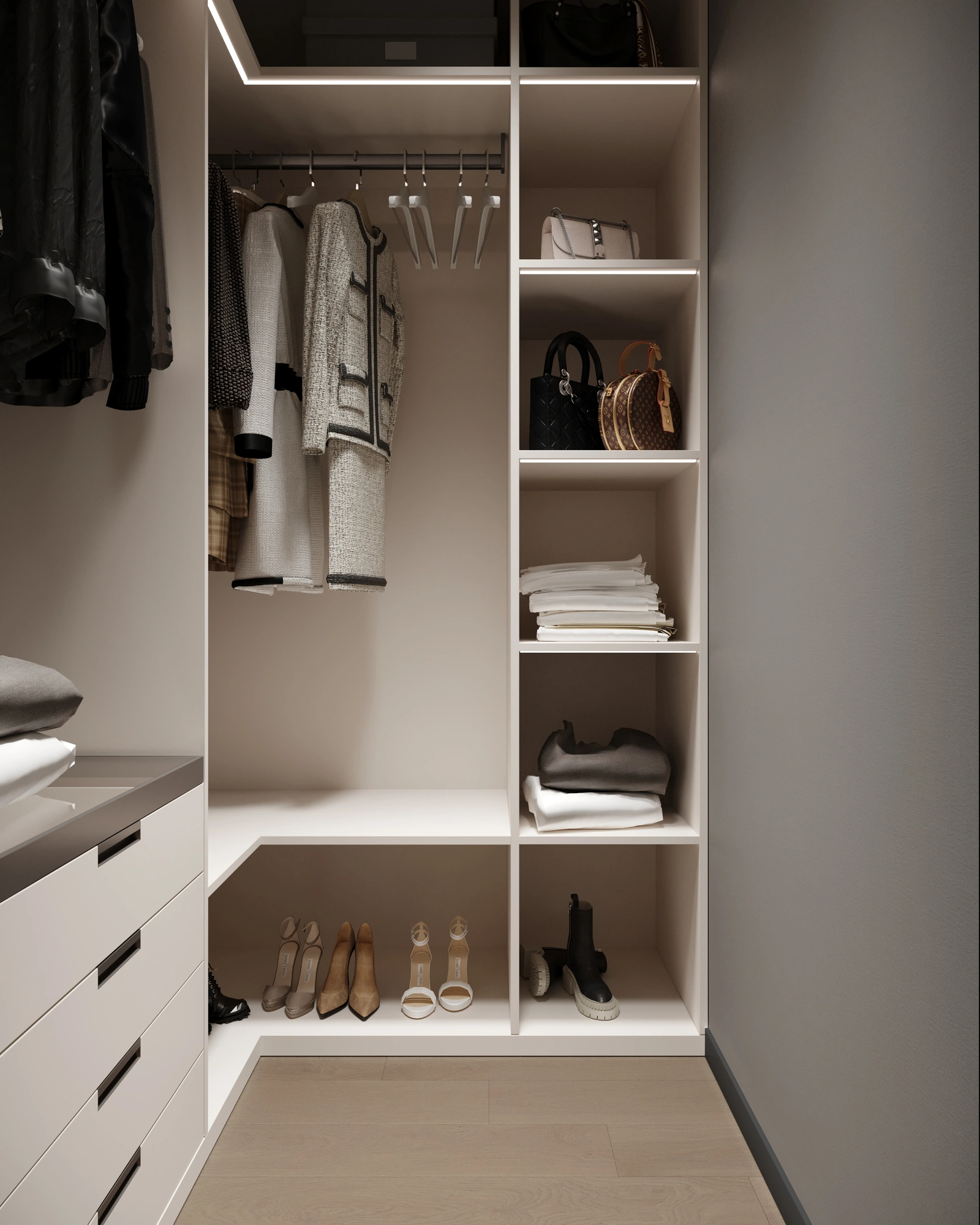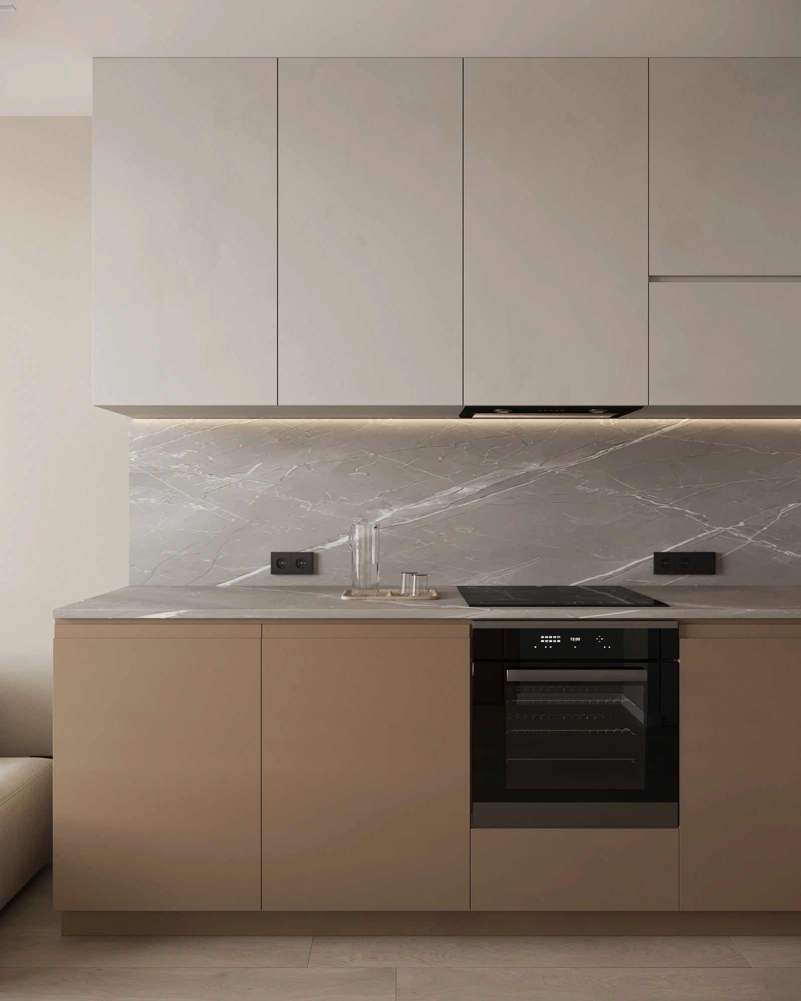Отделка спальни, кухни-гостинной и прихожей: плитка ПВХ на полу, флизелиновые обои светлых тонов, встроенные точечные светильники, подвесы, натяжной потолок, двери Holz