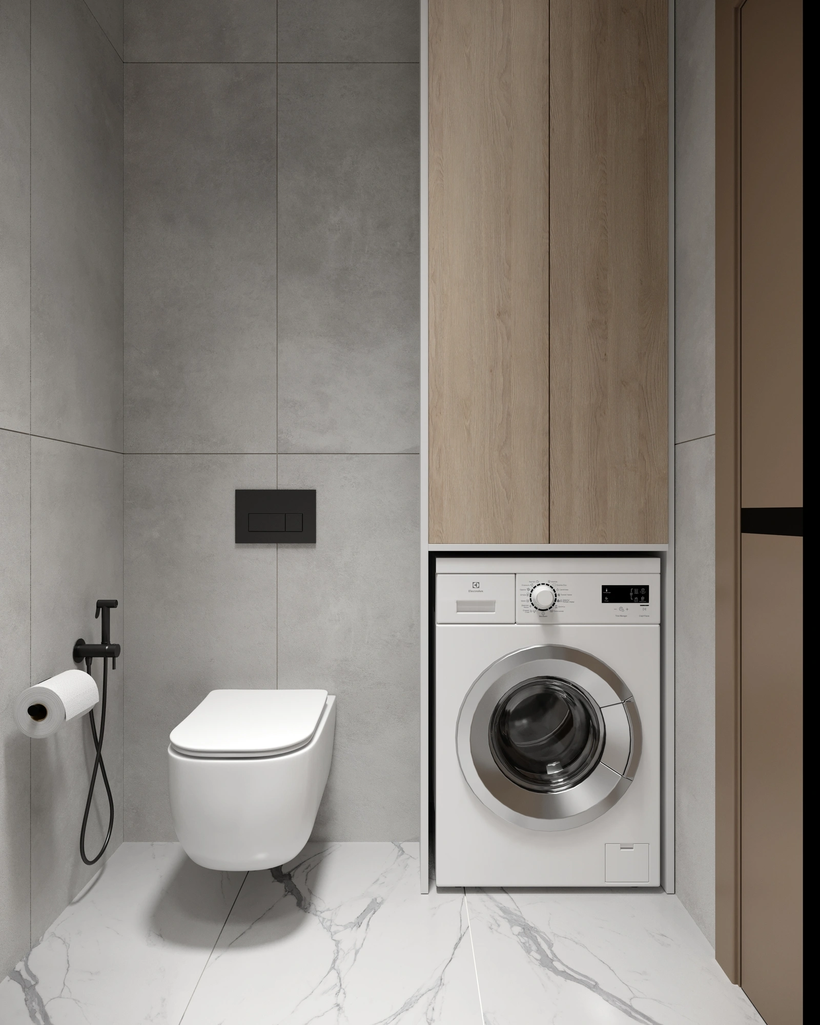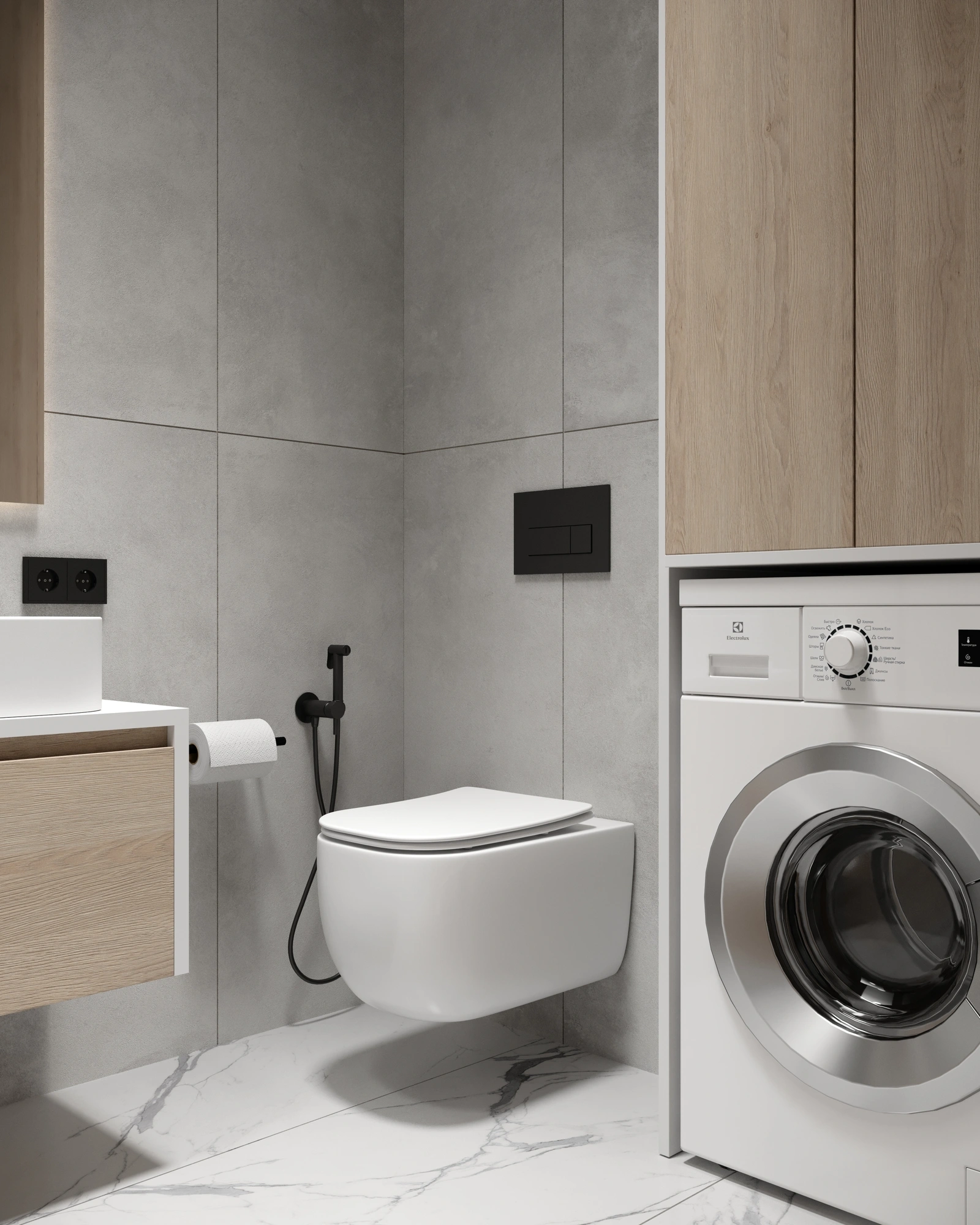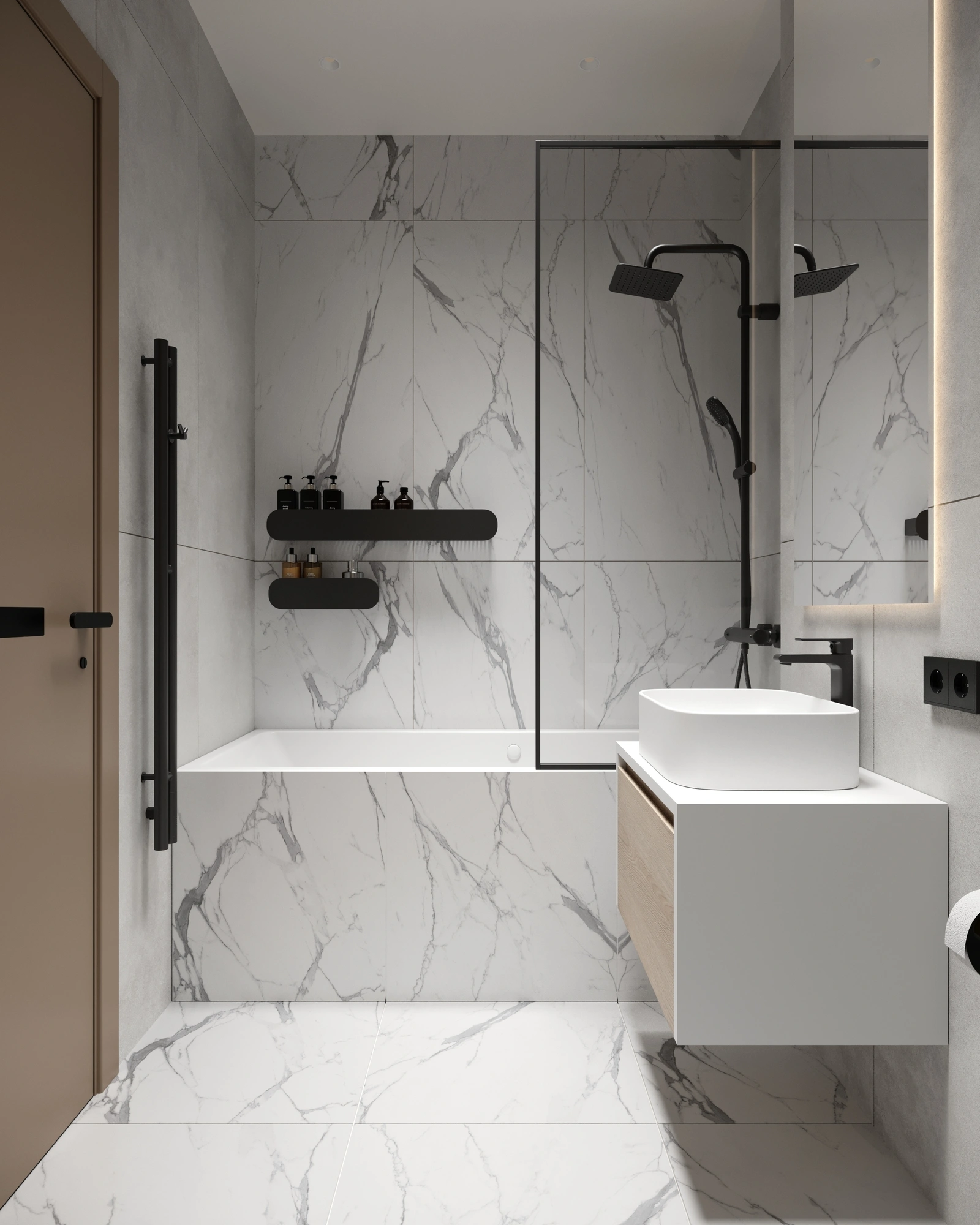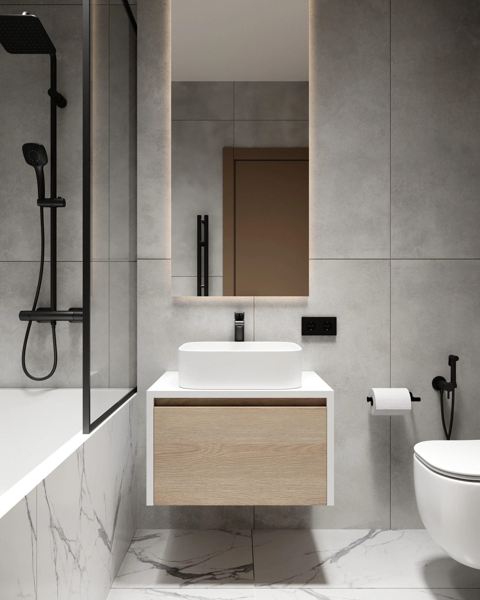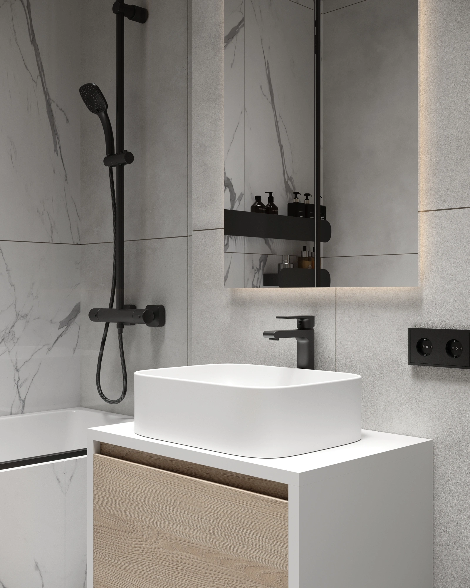 Отделка санузла: керамогранит, акриловая ванная, тумба с накладной раковиной, полотенцесушитель, унитаз, душ, бойлер, смесители, точечные светильники, натяжной потолок